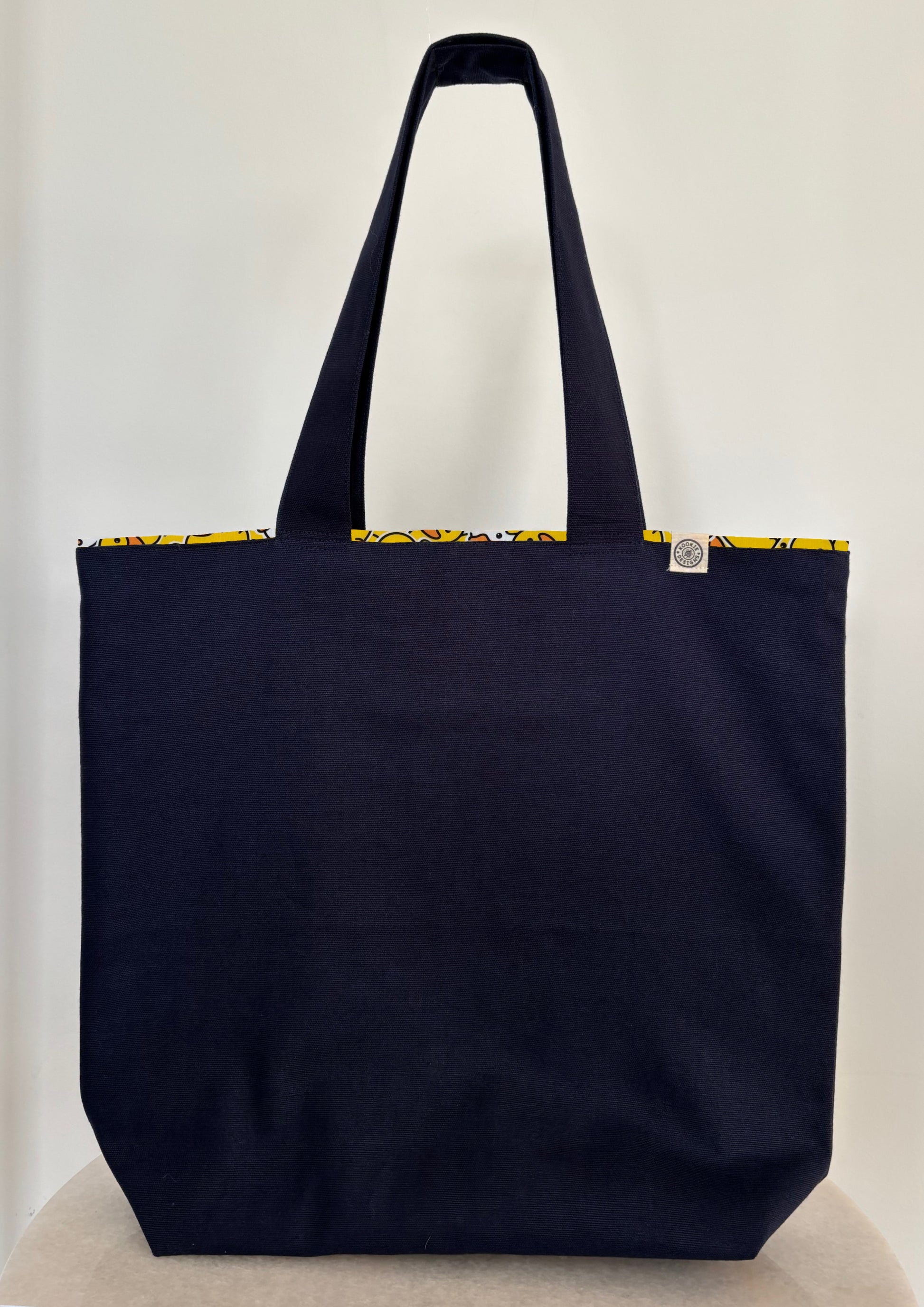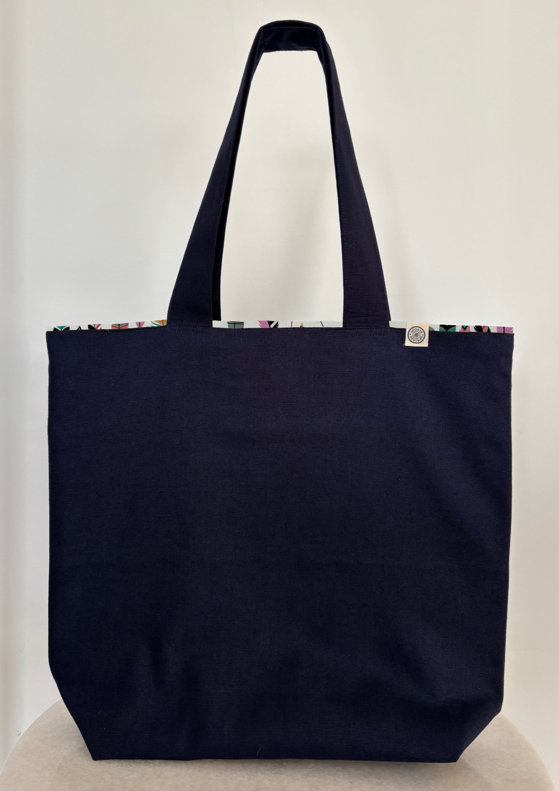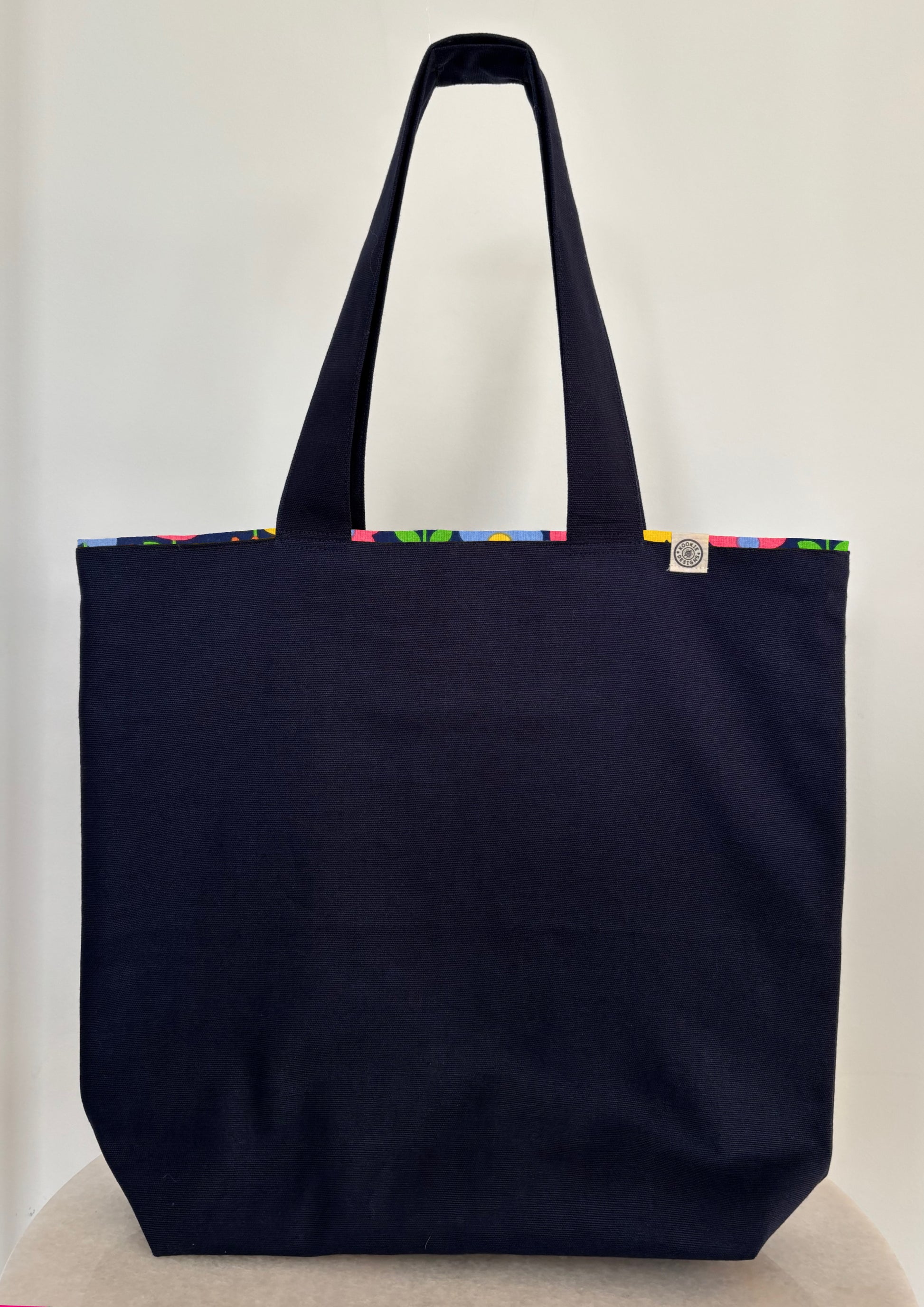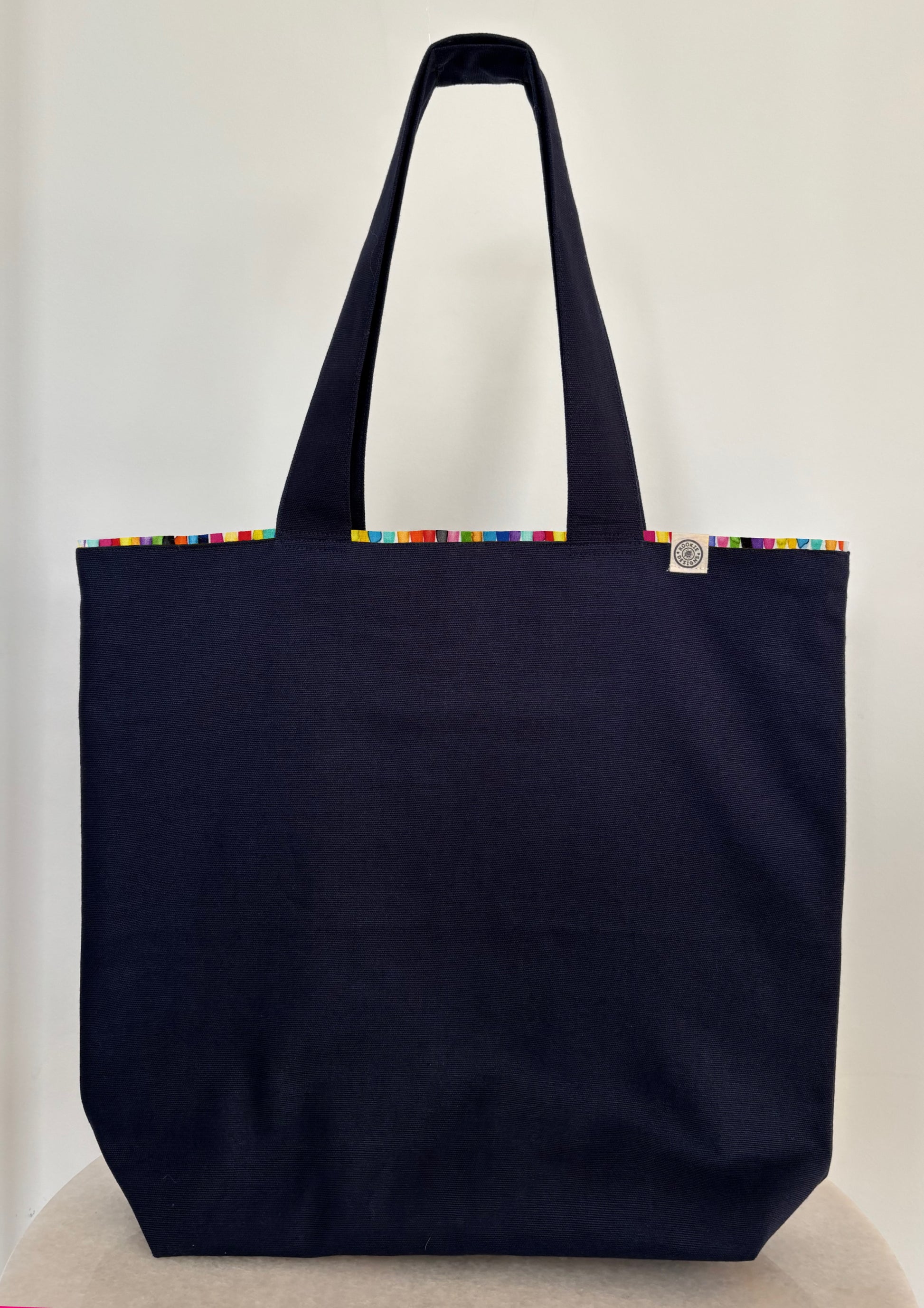 • Reversible tote bag, made with either navy cotton linen canvas or denim on one side, and colour cotton on the other (select option before adding to cart)
